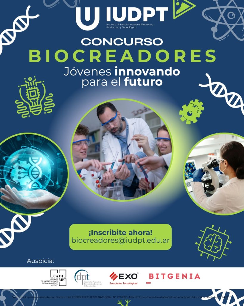 BioCreadores es una iniciativa destinada a estimular vocaciones científico-tecnológicas en estudiantes del último año del nivel secundario, mediante una experiencia formativa e innovadora orientada a las áreas de la biotecnología y la bioingeniería. A través de este concurso, buscamos generar un vínculo activo entre el IUDPT y las escuelas participantes, acompañando a docentes y estudiantes en el desarrollo de ideas y proyectos con impacto social, ambiental y productivo.